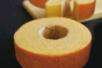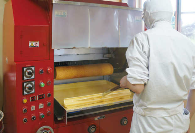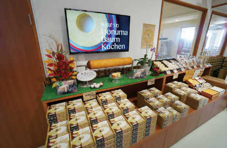 魚野の里側から店内に入ると右側にバウムクーヘンを作っている様子が見られるエリアがあります。ガラスのすぐ向こうでくるくる回るバウムクーヘンがとっても楽しく見えます。最初は細い棒状態なのに何度も生地をかけていくと太いバウムになってきます。
