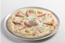 半熟たまごがたまらない!食べる直前に半熟たまごを崩してベーコンや生地全体に広げて召し上がれ。